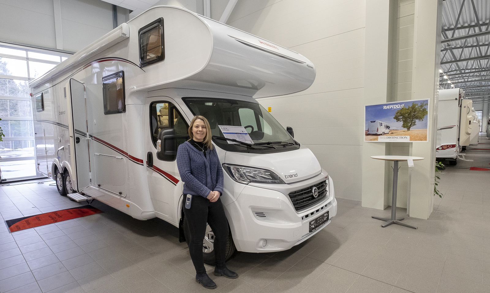 Linnea Östling framför sin favorit: En rejäl alkovbil från Dethleffs.