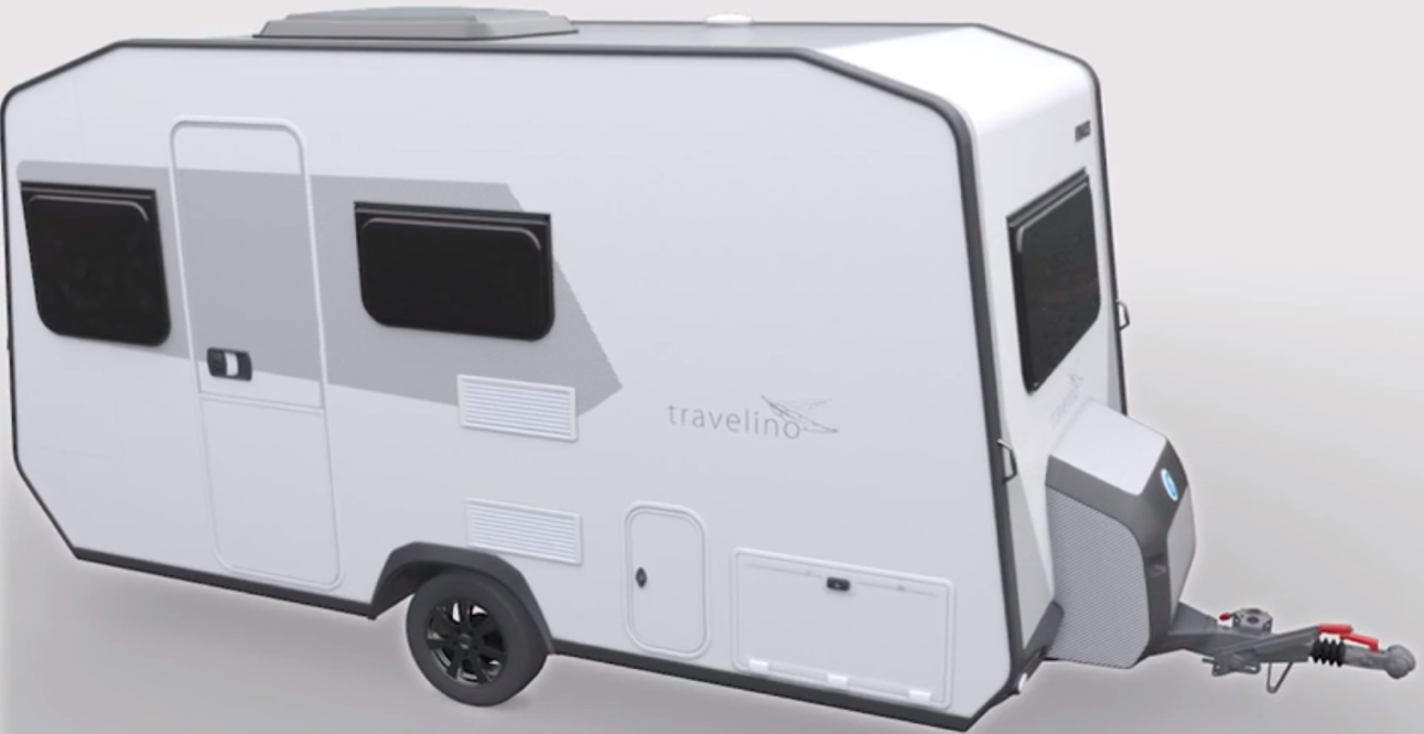 En reklamfilm från Knaus med Travelino som gått från koncept till färdig produktionsvagn och som ska visas på mässan i Düsseldorf. Det är visserligen en liten vagn men för att väga 750 kilo är den ändå rätt stor! Bikakor är en förebild för att få ner vikten i väggar och möbler.