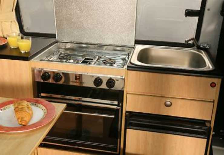 Det höjbara taket ger ståhöjd dagtid och dubbelbädd nattetid. Notera det läckra takräcket längst fram.