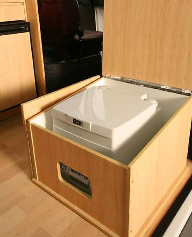 Toaletten är väl inget för den blyge men den finns trots allt under den bakåtvända stolen.