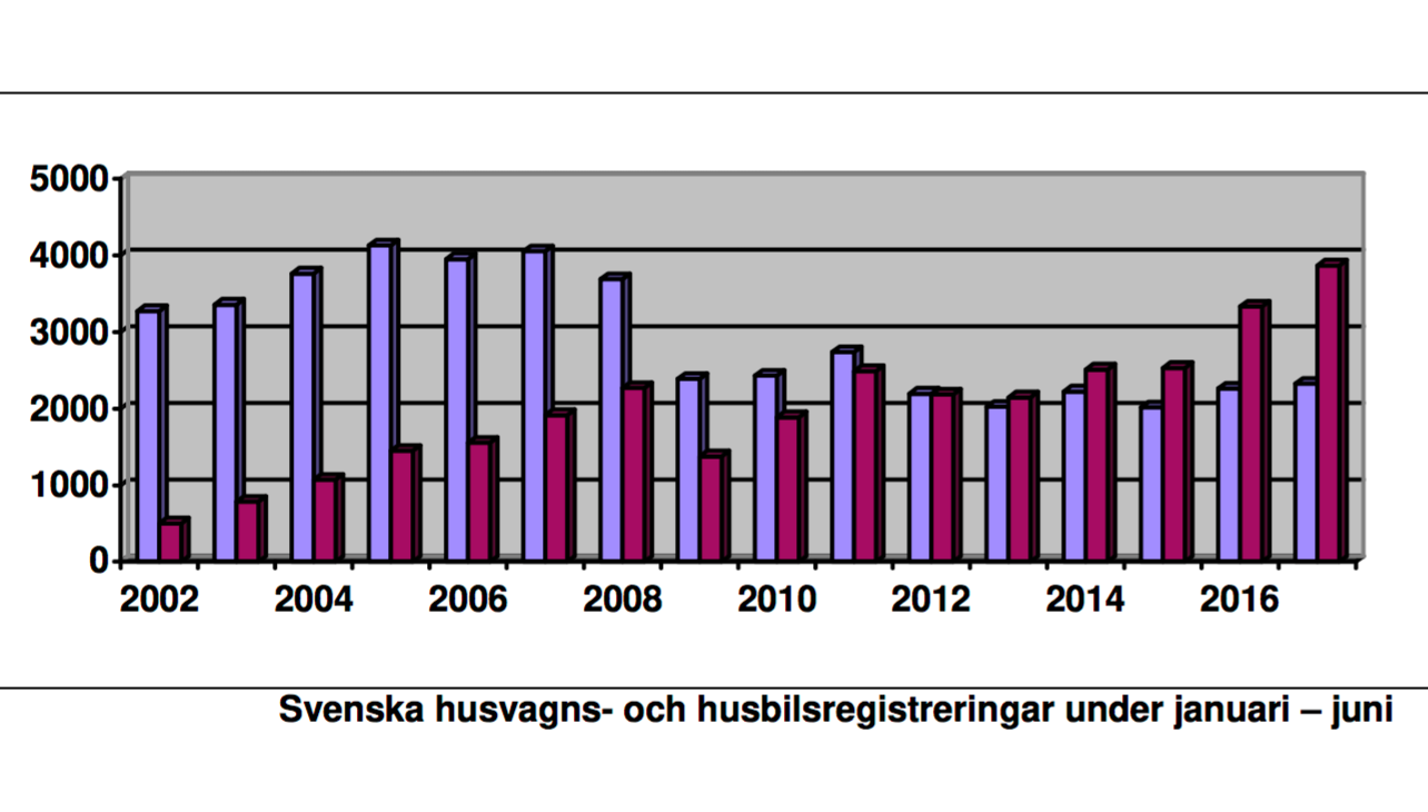 Juni månads husbilsregistreringar visar 1 020 stycken, medan det i juni föregående år registrerades 803 husbilar. Hittills under kalenderåret 2017 har det totalt registrerats 3 869 husbilar, medan det under motsvarande period 2016 registrerades 3 333 stycken. I procent innebär detta en ökning med 16,08 % för år 2017.