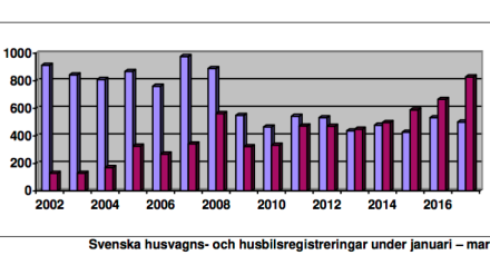 Under juni månad 2017 registrerades 464 husvagnar. (Motsvarande månad året dessförinnan registrerades 466 stycken.) Hittills under 2017 betyder det 2 325 registrerade husvagnar mot 2 262 under samma period 2016. I procent innebär detta en ökning med 2,78 %.
