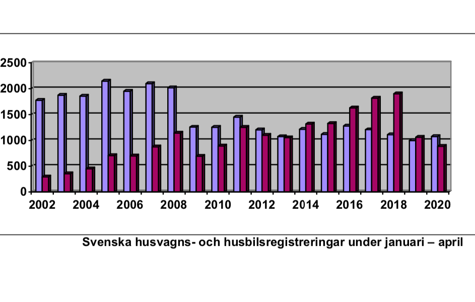 Under april månad 2020 registrerades 562 husvagnar. (Motsvarande månad året dessförinnan registrerades 612 stycken.) Hittills under 2020 betyder det 1 078 registrerade husvagnar mot 1 001 under samma period 2019. Detta är en ökning med 7,69 procent.