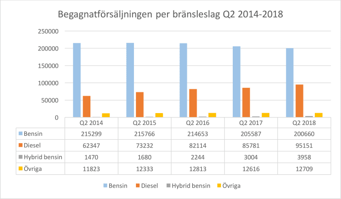 Under andra kvartalet 2018 såldes 9 370 fler dieselbilar än motsvarande kvartal 2017. Totalt såldes 95 151 bilar vilket är den högsta försäljningssiffran någonsin. Det motsvarar 30 procent av alla bilar som såldes under kvartalet. Mest ökade dieselförsäljningen i Blekinge län (+ 20,3 procent) och Kronobergs län (+20,8 procent). Lägsta ökningen var i Stockholms län (+ 1,9 procent). Försäljningen av begagnade bensinbilar minskade med 2,4 procent.