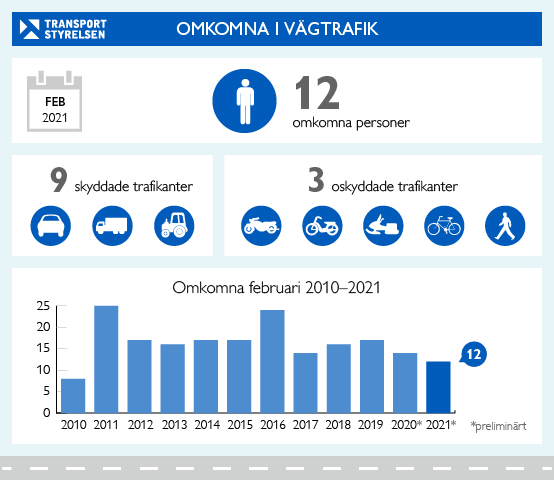 Under de senaste tolv månaderna (mars 2020–februari 2021) har därmed 177 personer omkommit i vägtrafiken vilket väl ligger under nollvisionens målsättning. Under de senaste föregående tolv månaderna (mars 2019–februari 2020) omkom 211 personer. Jämför man med ett femårs medelvärde för motsvarande tidigare tolvmånadersperioder har antalet omkomna minskat med 34 procent.