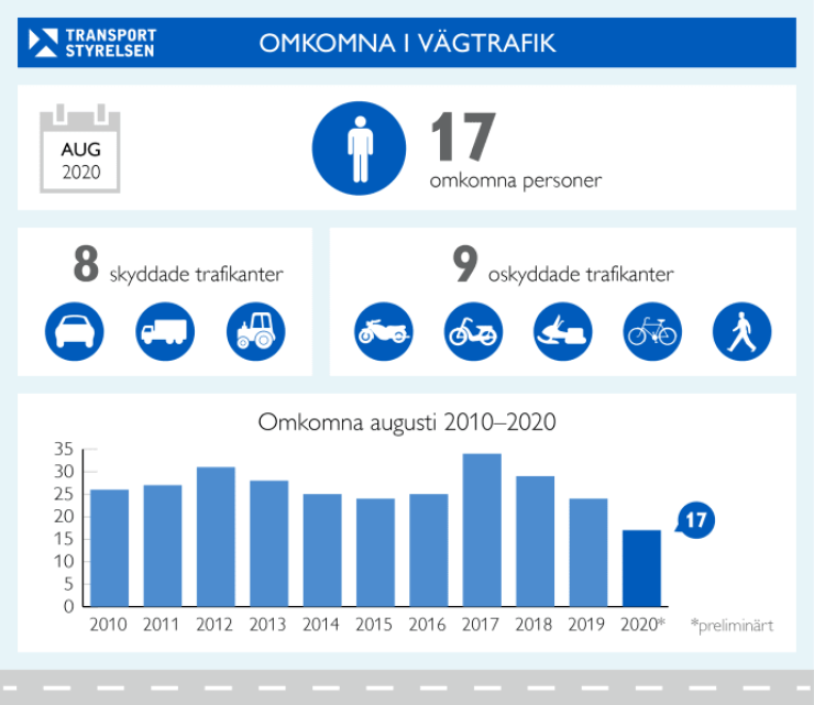 Under augusti månad i år omkom 17 personer i trafiken och 1 418 skadades varav 151 svårt och 1 267 lindrigt. Det visar de preliminära uppgifter som kommit in till Transportstyrelsen den 15 september. Det är 17 färre omkomna än under augusti förra året.