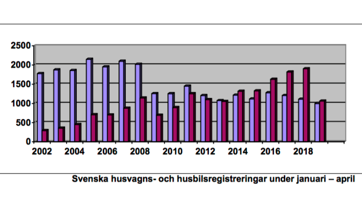 April månads husbilsregistreringar visar 612 stycken medan det i april förra året registrerades 1 093 husbilar. Hittills under kalenderåret 2019 har det totalt registrerats 1 062 husbilar, medan det under motsvarande period 2018 registrerades 1 904 stycken. I procent innebär detta en minskning med 44,22 för hittillsvarande månader 2019.