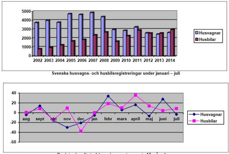 Juli månads husbilsregistreringar visar 446 stycken, medan det i juli föregående år registrerades 411 husbilar. Hittills under kalenderåret 2014 har det totalt registrerats 2 958 husbilar, medan det under motsvarande period 2013 registrerades 2 556 stycken. I procent innebär detta en ökning med 15,73 % för år 2014.