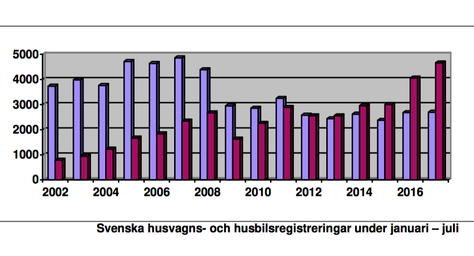 I diagrammet har husbilar röd stapel och husvagnar blå.