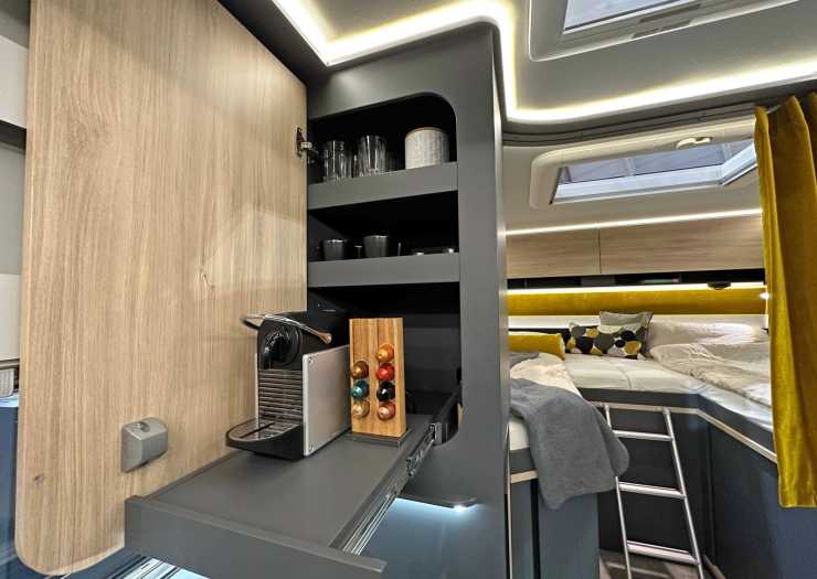 Köksskåpet har till exempel en utdragbar hylla, där det står en espressomaskin i visningsexemplaret. Men den kan också användas som arbetsyta, försäkrar killen. Även förvaringsboxen på andra sidan dörren har en yta som är stadig och hård nog för att användas när man lagar mat – eller fixar något annat, kan man gissa.
