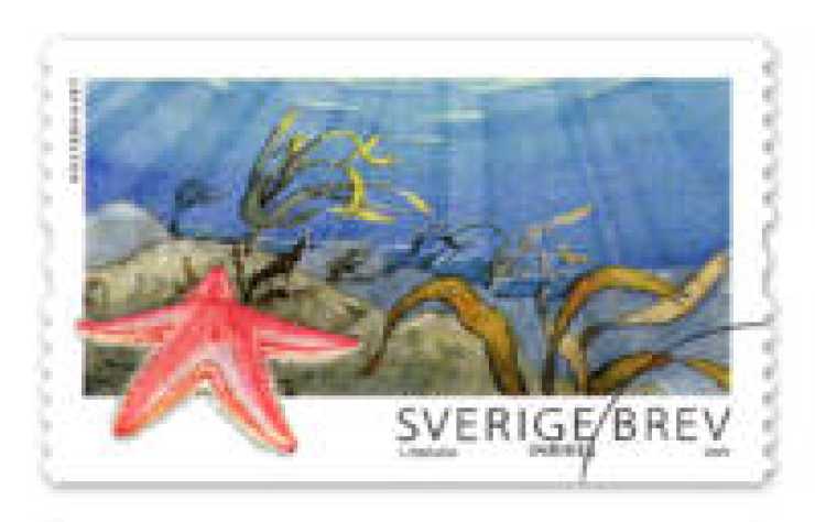 5. Kosterhavet vid norra Bohuslän är Sveriges artrikaste havsområde. Områdets artrikedom representeras på frimärket av en kamsjöstjärna (Astropecten irregularis).