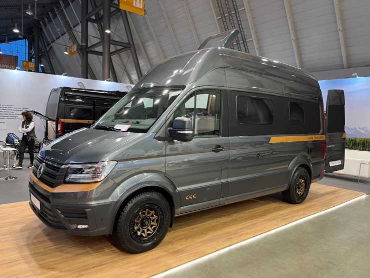 Globe-Traveller Falcon med ett chassi på VW Crafter har en unik planlösning med en längsgående soffa och badrum längst bak. Fyrhjulsdrift, modern inredning och vattenfri toalett är en del av allt som hittas i den här korta husbilen under sex meter.