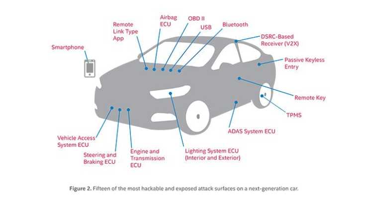 Elektronikföretaget Intel har listat femton attackytor på nya bilar. Som exempel nämns Bluetooth och den så kallade OBD II-porten, diagnosuttaget. De flesta säkerhetsriskerna på Intels lista är olika typer av ECU:er. Förkortningen ECU står för Electrical Control Unit och en modern bil innehåller hundratals av dessa små datorer. ECU:er skickar meddelanden om allt från däcktryck till hastighet och säkerhetsrisken med dessa nätverksuppkopplade enheter uppstår om de kan förmedla annat än vad som är tänkt.