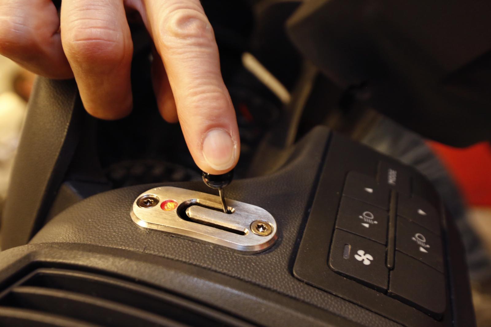 Handbromsen styrs elektriskt med en strömbrytare som fälls in i instrumentpanelen. Strömbrytaren ser ut som ett uppochnedvänt J för att undvika att bromsen aktiveras av misstag.