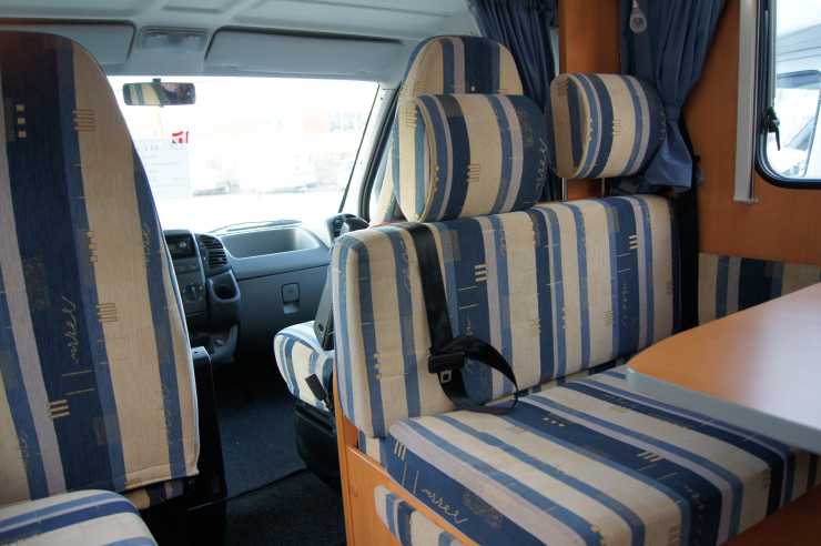 Men tyvärr får man åka olagligt/osäkert då det sällan är plats för fler än förare samt tre passagerare. Därför fastnade jag för en begagnad Hymer 544 Camp 2007, när jag skulle välja fordon. Just detta exemplar var importerat och på säljuppdrag, men har en intressant planlösning som ger totalt sex bältade platser, då det är en fast vägg mellan förarutrymmet och bodelen.
