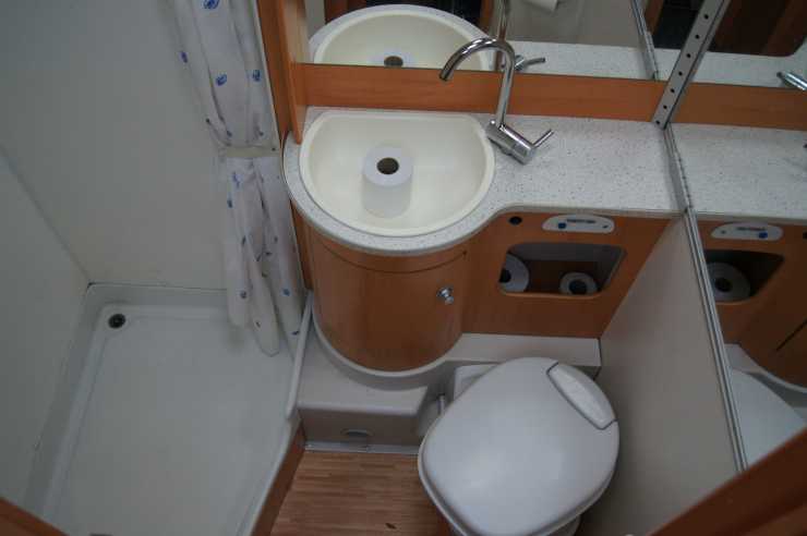 Toalett och dusch finner vi längst bak till vänster i bodelen. Man går i och ur bilen längst bak till höger, och längst bak finner vi köksdelen, ovanligt men det känns inte så dumt.