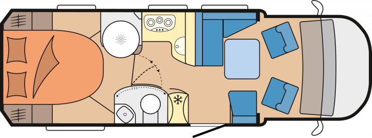 Den helt nya modellen Optima T65GQ är en planlösning som finns i båda serierna Optima De Luxe och Optima Premium. Optima T65GQ har queenbed i aktern och i bilens mitt ett badrum med duschkabin till vänster och toa/handfat till höger i bilens färdriktning. På sedvanligt vis kan hela hygienavdelningen stängas av med dörr i mittgången. En egenhet med just T65GQ är en extra skjutvägg som gör att man kan gå på toaletten utan att störa den som eventuellt ligger och sover längst bak. På motsvarande vis kan denne gå in på toa utan att behöva visa sig för de som sitter fram i sittgruppen. På tal om sittgrupp så har T65GQ en rymlig vinkelsoffa som standard och bakom den ett praktiskt vinkelkök. Kylen är den stora 150-litersvarianten, Super Slim Tower.