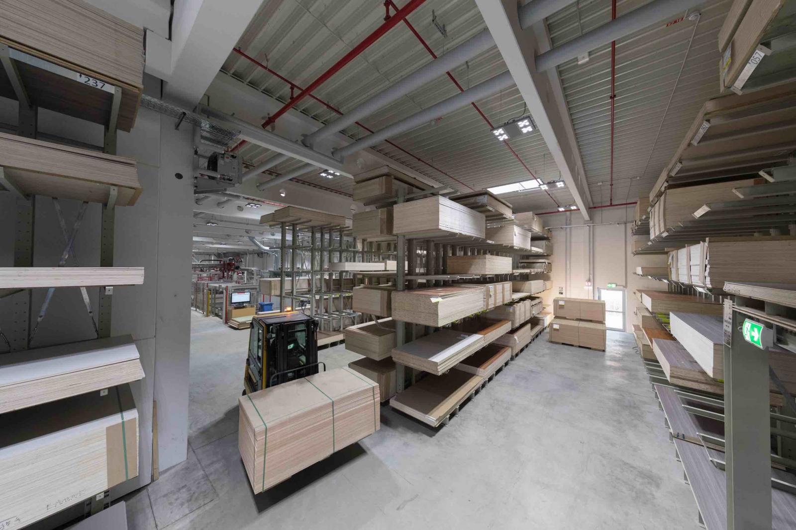28 ton material används varje dag som hopräknat per vecka blir till 170 000 delar. Maskinerna matas från ett lager med plats för 230 pallar där skivorna till skåp och lådor ligger och väntar på gaffeltruckarna. Vad som ska till respektive maskin visas på displayer och maskinen behöver inte matas manuellt, den tar materialet direkt från pallen och kapar det såväl med såväl längsgående samt tvärgående snitt samtidigt och upp till 30 hål borras i en enda operation.