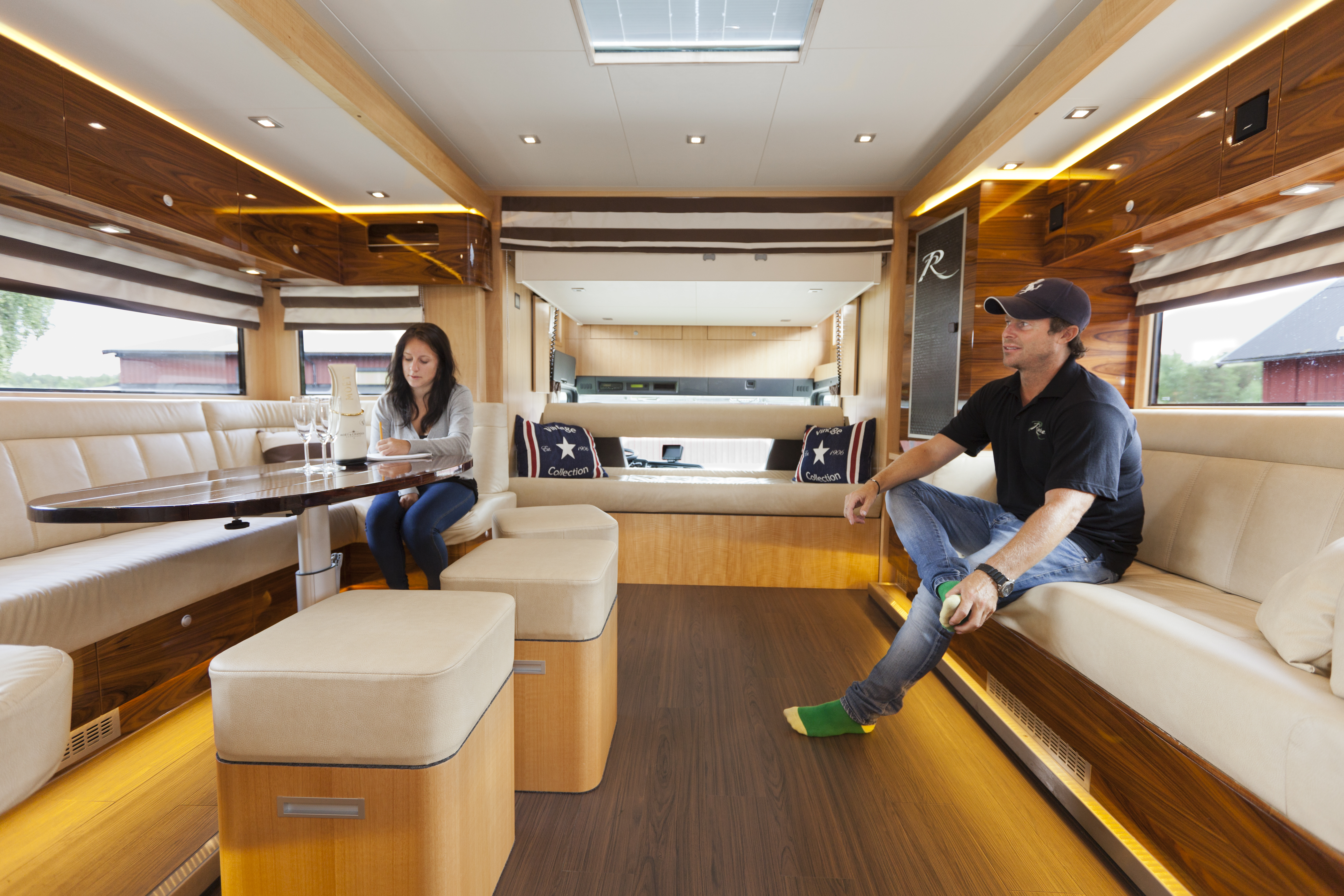 Inne i bilen visar han upp alla finesser och utrymmen med nöjd min. De slideouts som fungerar genom hydraulik gör att bilen i parkerat läge får ett riktigt vardagsrum med lounge som har sittplats för 12-14 personer. I loungen finns det ordentligt med förvaringsutrymme och mycket teknik, vilket gör att gänget som följer med Peter när han är ute på äventyr inte behöver bli uttråkade. I loungen finns det LED-tv, BOSE surround system, Playstation 3 och X-box.