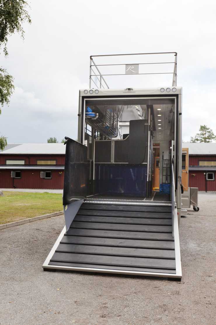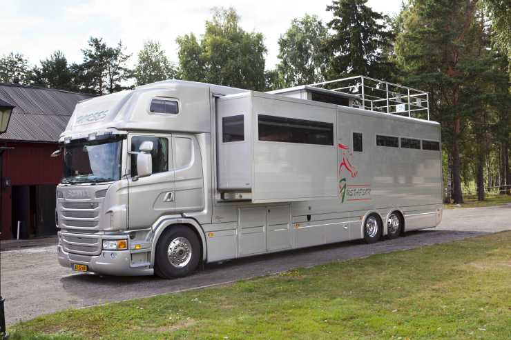 Det är en stor husbil vi står inför när vi får tillfälle att inspektera Peter Gustafsons specialbygge för hästar och människor. Chassiet är specialbeställt hos Scania och har maxat gränserna för vad som får köras i Europa.