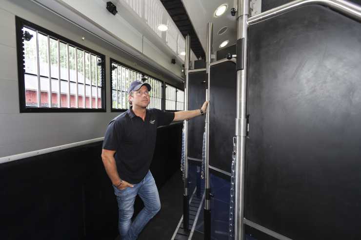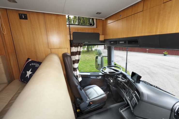 – Hästhusbilen är totalt 14 meter lång och har 27 ton som totalvikt, säger Peter och kliver in i bilen.