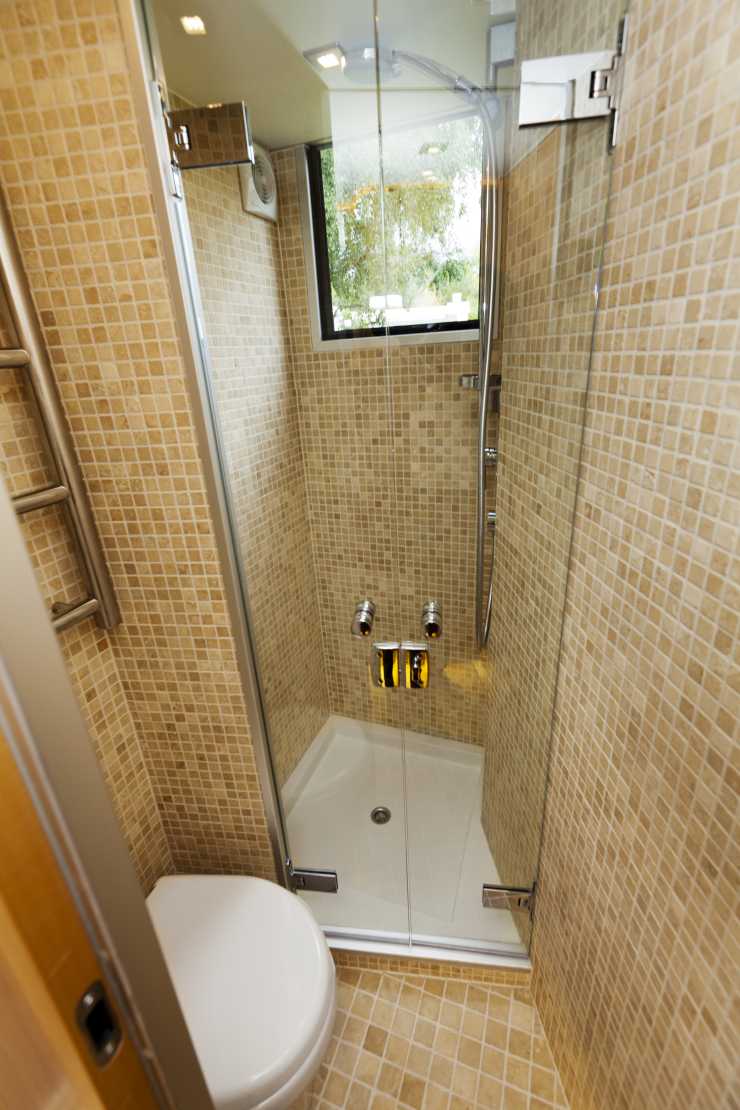 I mitten av bilen finns en badrumsavdelning i italiensk mosaik. Den är uppdelad med vacuumtoalett och dusch i ett enskilt rum och Alape handfat och spegel utanför. Peter har valt Hansgrohe kranar till både duschen och handfatet. Övriga tillbehör som handduks- och tvålhållare kommer från Tiger.