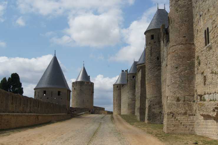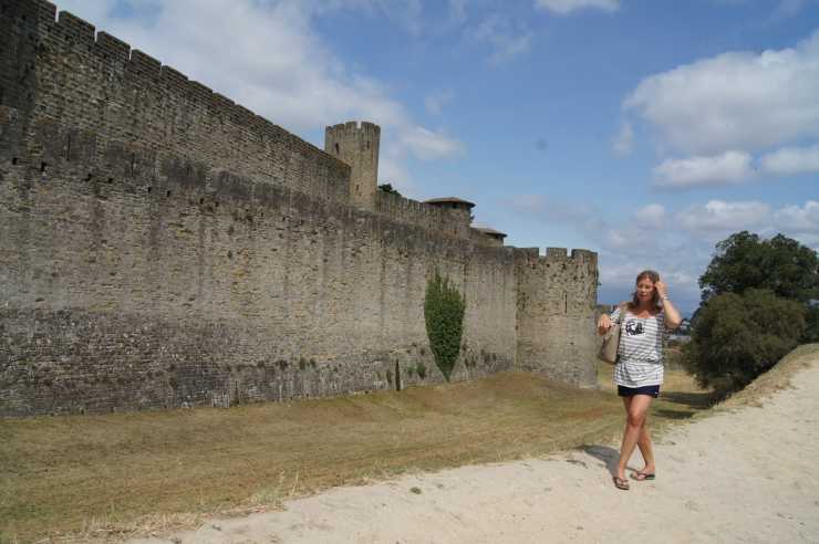 Det är uppförsbacke och varmt. Tacksamt nog finns flera kaféer och restauranger på vägen upp så ett vätskestopp passar bra. Väl på plats utanför Cité de Carcassonne, infinner sig en stark wow-känsla. Själv har jag aldrig sett något liknande. Längs med den 1,6 kilometer långa yttre ringmuren följer en inre mur. Vakttorn och runda torn delar muren i sektioner.