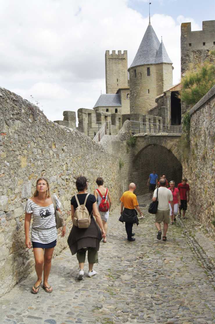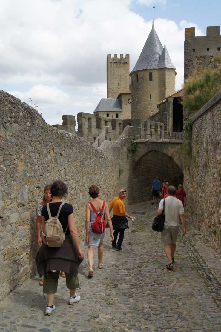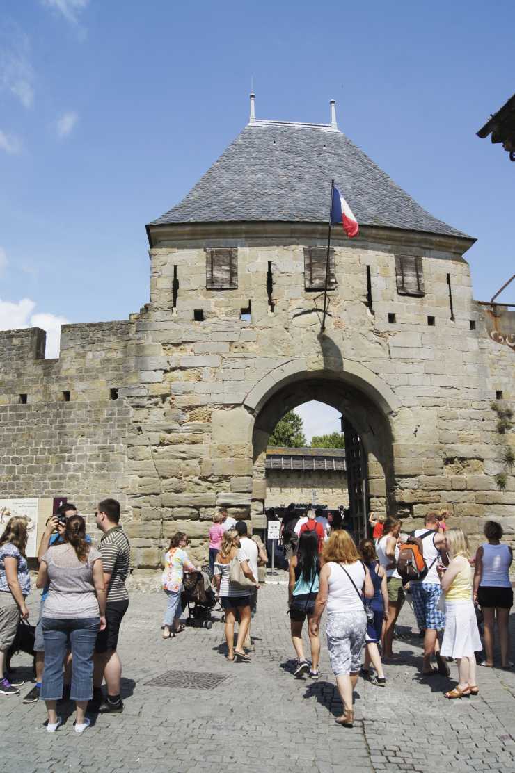 Vi traskar in genom Narbonnaiseporten, eller Narbonneporten, byggd på 1200-talet. Porten är fästningens ingång från öst och är flankerad av två torn med spetsiga tak och ett dubbelt vakttorn. Portens utformning hade inte enbart militär funktion, utan skulle även visa borgens och stadens status. Byggnaden är ett exempel på gotisk arkitektur. Ingången kunde stängas av med en kätting, och porten hade dubbla lås. Vid krigssituationer kunde träbjälkar monteras över porten och på toppen av tornen för att förstärka försvaret. Idag är porten den enda bilvägen in till Cité.