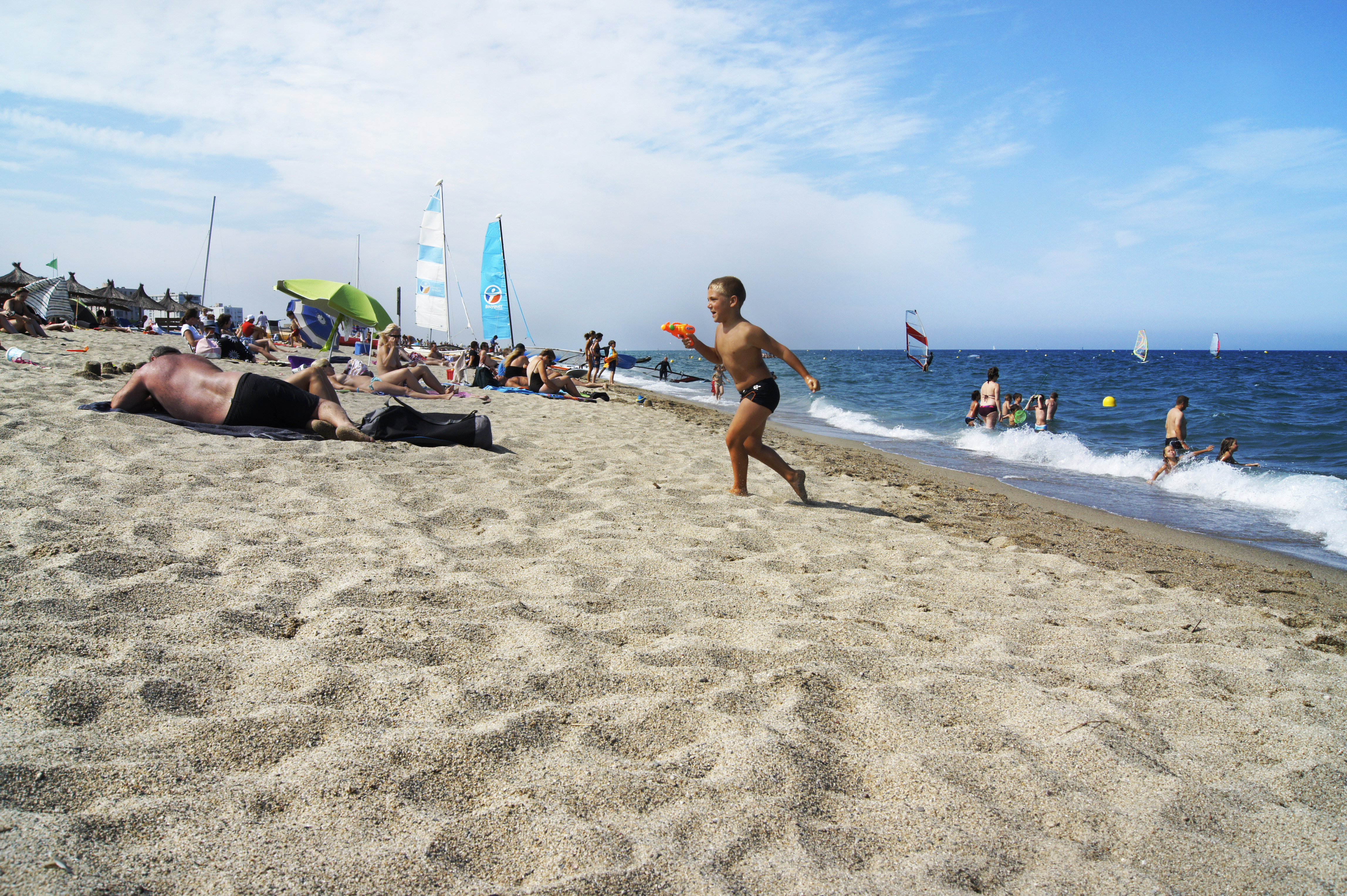 Vi tar sikte på staden Perpignan och följer därefter skyltarna mot Barcelona. Bara 18 mil från den pulserande, spanska jättestaden, hittar vi vårt franska campingparadis. Staden heter Argelès-sur-Mer och uttalas ”Arschälä syr mär”. Säger man namnet tillräckligt snabbt låter det som det mindre städade ordet för rumpan. Värdelöst vetande men ett bra sätt att komma ihåg vad stället heter.