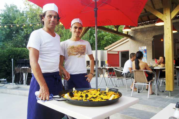 En dag i veckan serveras paella på campingplatsen Camping Les Pins. Maten är god och prisvärd.
