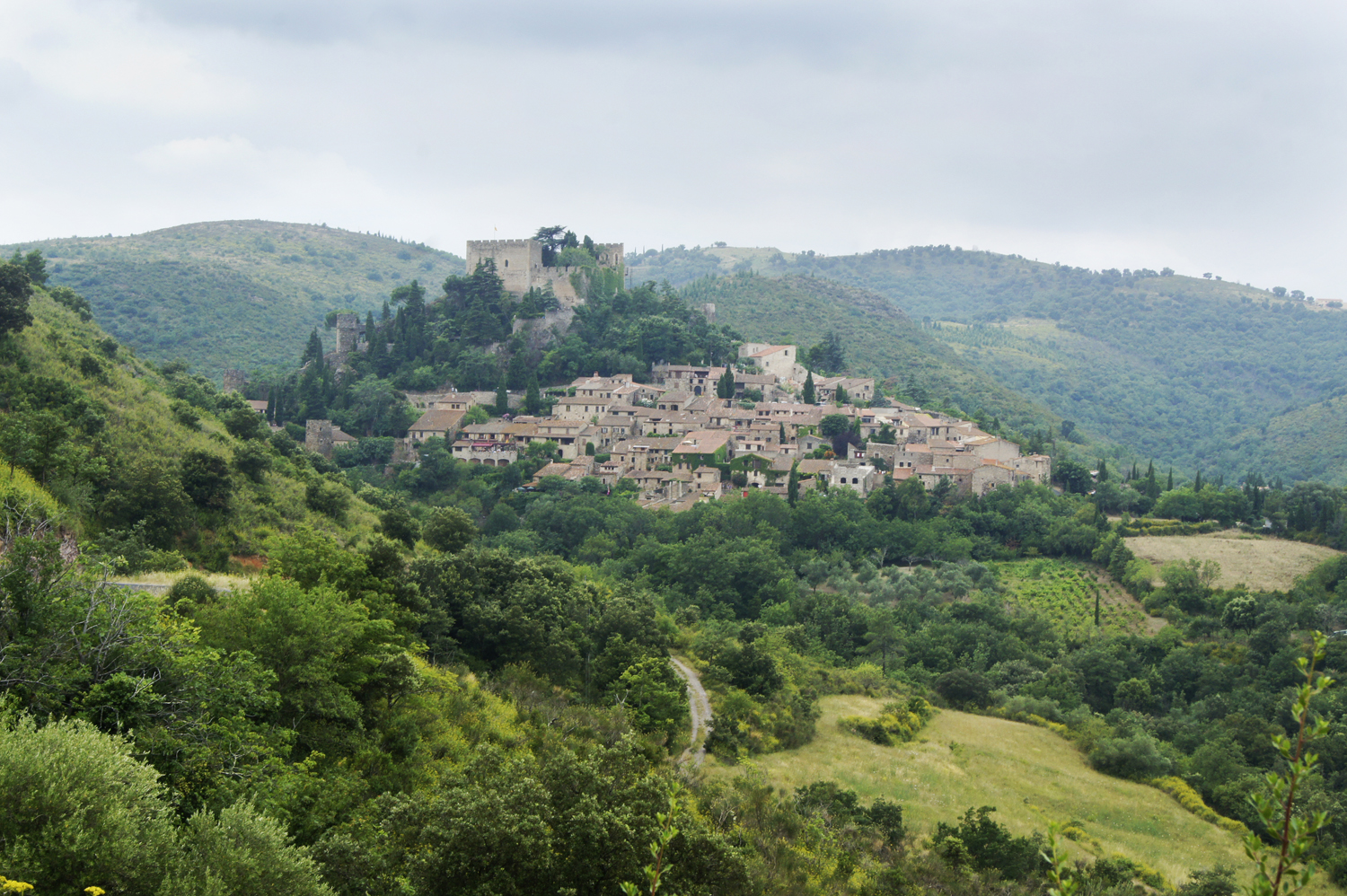 Den lilla medeltidsbyn Castelnou ligger inbäddad vid foten av kullar och med Aspres Canigou, ett mytomspunnet berg enligt katalansk folktro, i bakgrunden.