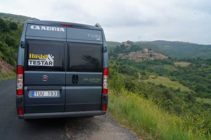 Vi kommer dit en mulen dag i början av juli 2011 och ställer husbilen på parkeringen vid foten av berget. Där börjar vandringen mot borgen på toppen. Gatorna är trånga och vindlande på medeltida sätt och här och där finns små butiker med konsthantverk, kaféer och krogar.