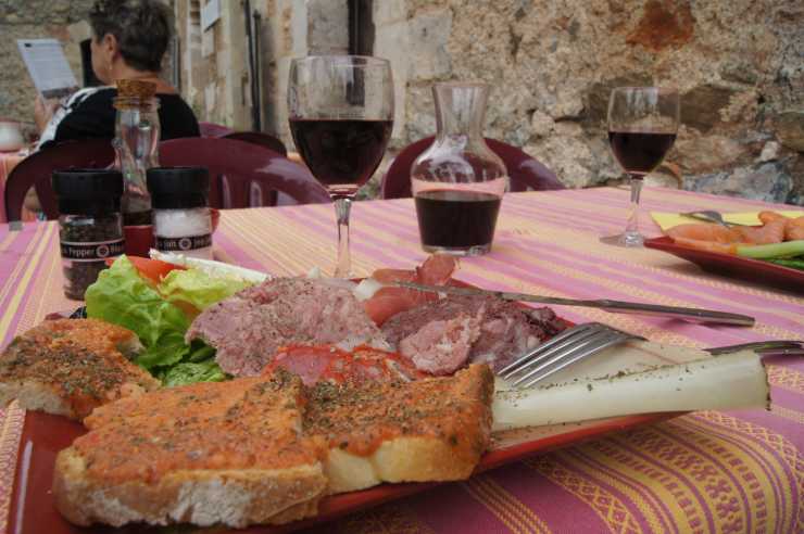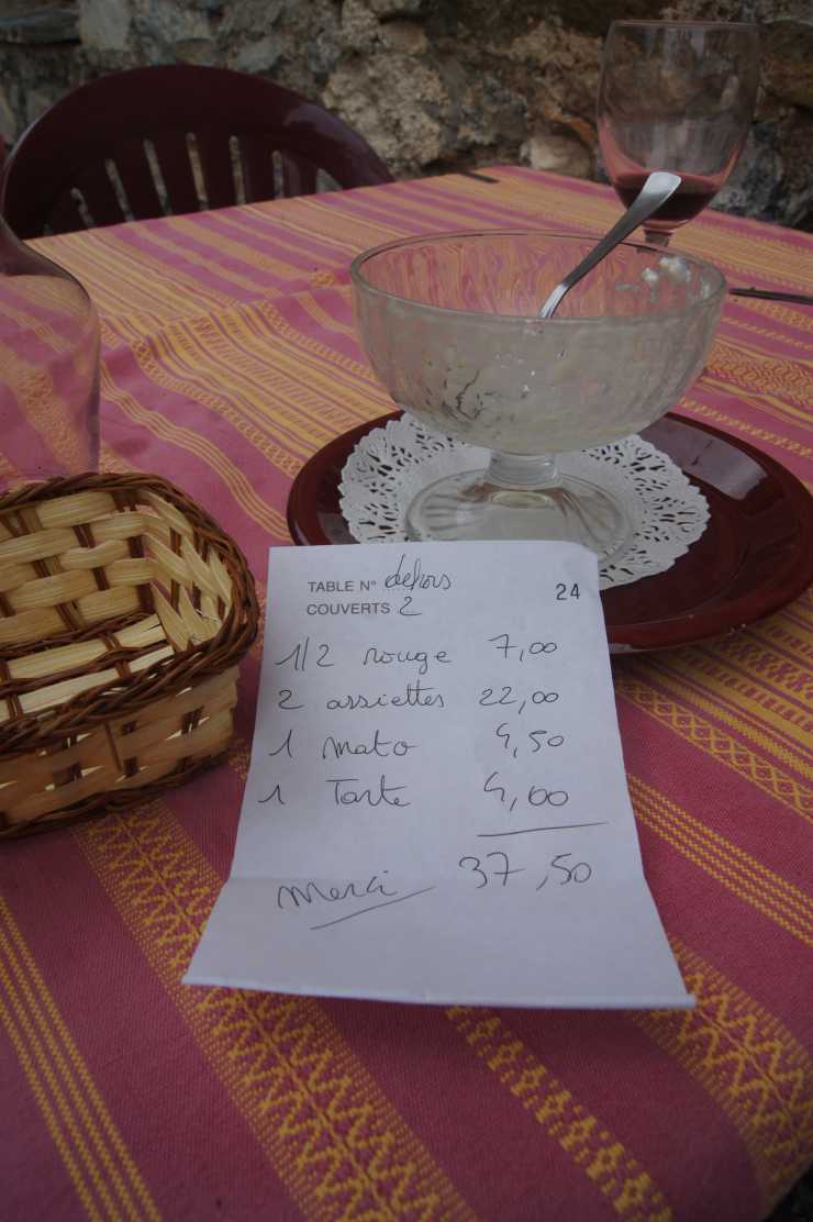Övriga gäster talar franska och många stora sällskap sippar på kaffe och en avec, uppenbarligen redan klara med sin lunch. Menyn innehåller mycket vilt och personalen bär medeltidsinspirerade kläder. En irriterad servitör meddelar torrt att vi kommer ”trop tard” (för sent), mat serveras bara till 16. Besvikna lommar vi därifrån, mest ledsna över bemötandet.