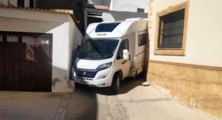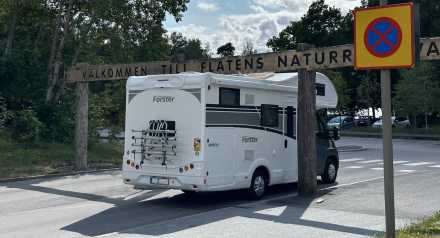 En husbil hade slirat av vägen och hamnat i diket på ett minst sagt spektakulärt sätt, upp och ner med bakändan i luften.