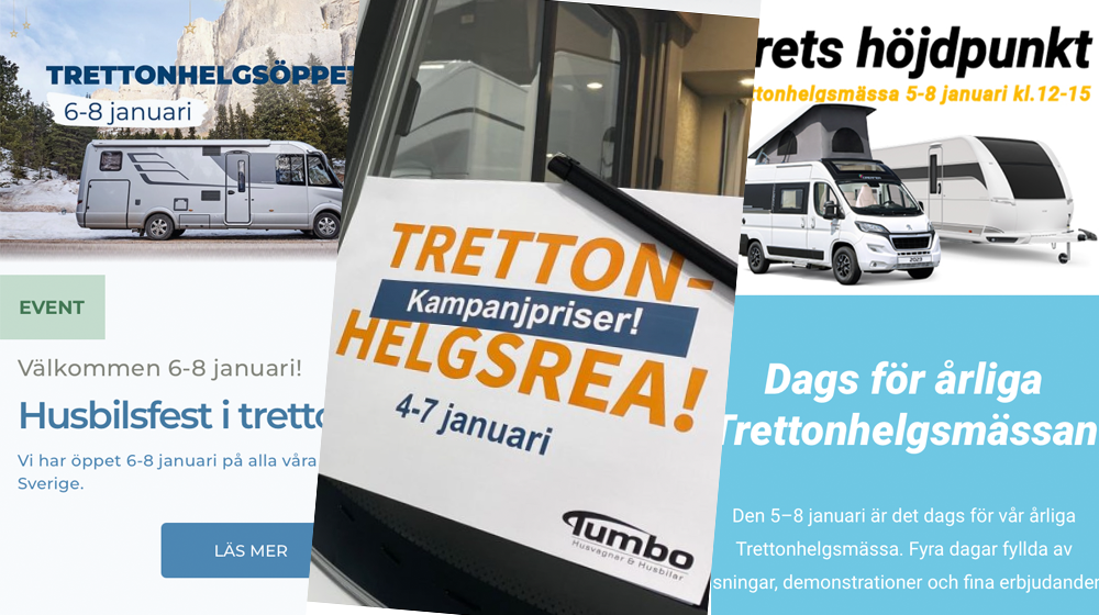 Trettondagshelgen är lika med kampanjhelg hos många husbils- och husvagnshandlare, Så även i år. Förutom möjlighet att kolla på 2023 års modeller, erbjuder många roliga aktiviteter och kampanjpriser.