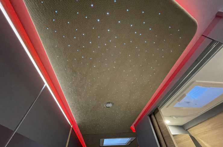 Omklädda säten, väggar och diodhimmel med slumpvisa stjärnfall i taket på Pössl by Rühl. De klär även ratt, friskluftsintag och instrumentbräda i skinn och syr med en symaskin som de enligt egen uppgift är ensamma om i Europa.