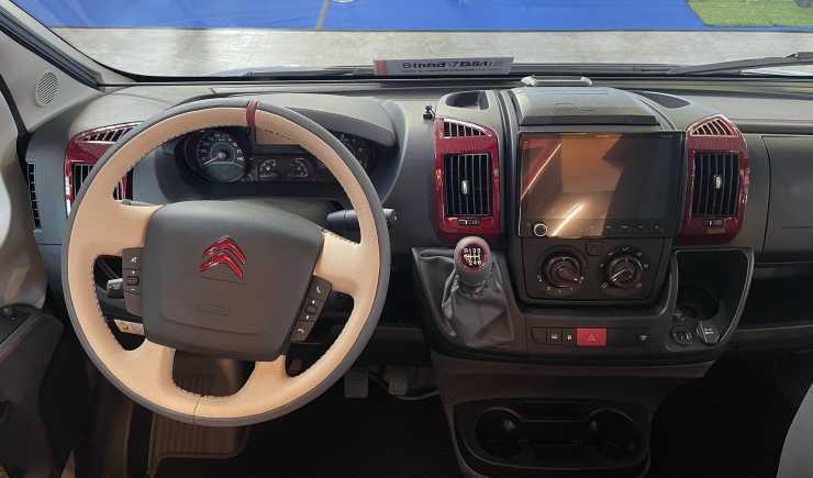 Instrumentbräda på en Mercedes-Benz Sprinter klädd i skinn och med färgade linjer och fält. Rühl jobbar allra helst med Mercabilar och ska enligt uppgift snart komma med helt egna plåtisar på Sprinter som lär bli utöver det vanliga. På beställning tar de sig an även andra fabrikat.