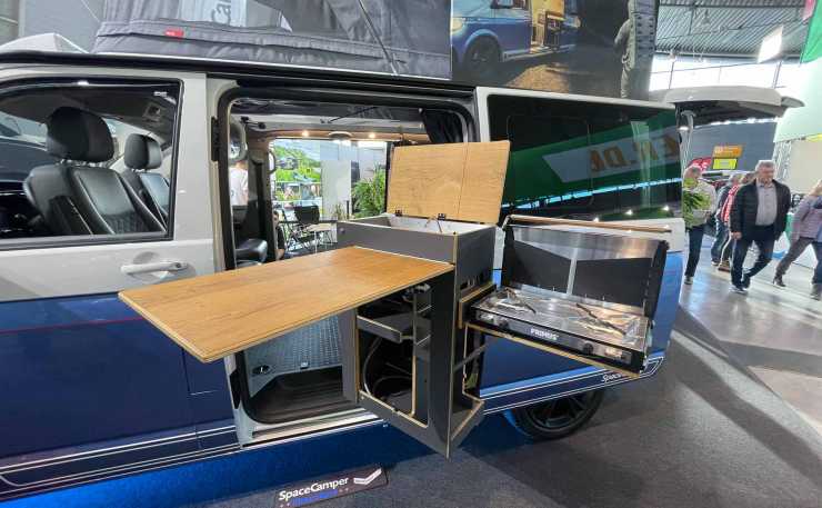 Köket i Space Campers campingbil går att svänga ut för att bli större, och större.