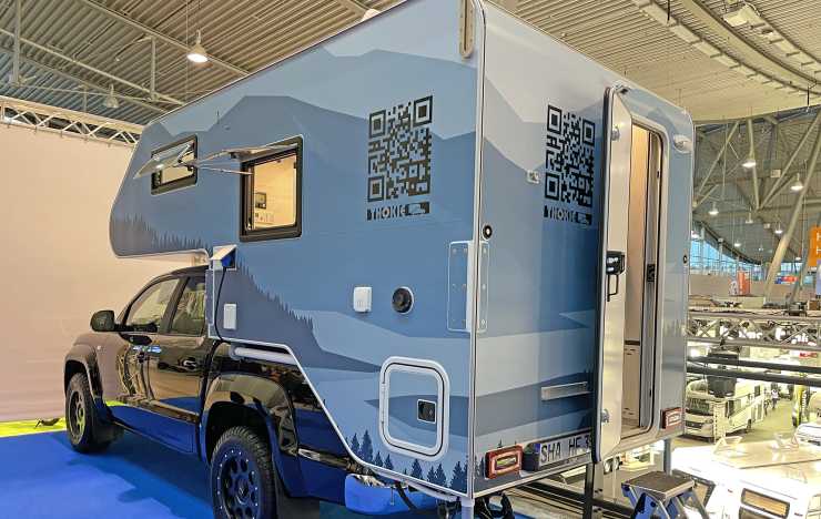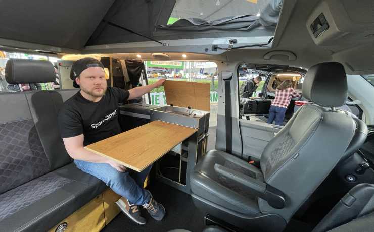 Till exempel märket Space Camper. En kille i montern visar oss en massa funktioner. Han fäller ut och in finesser utanpå och inuti bilarna. Det går i ett: Kök, frys, avskärmningar, lilla toaletten i dörren. Allt gjort för att kunna leva på den lilla ytan – och anpassat efter den enskilda kundens behov.