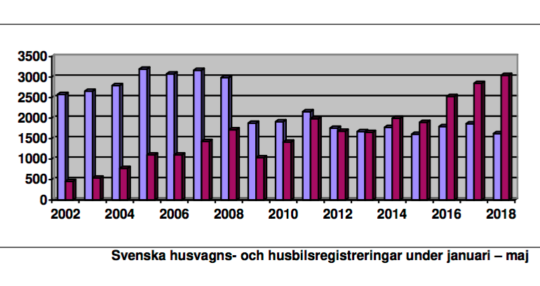 Under maj månad 2018 registrerades 510 husvagnar. (Motsvarande månad året dessförinnan registrerades 653 stycken.) Hittills under 2018 betyder det 1 623 registrerade husvagnar mot 1 861 under samma period 2017. I procent innebär detta en minskning med 12,78 procent.