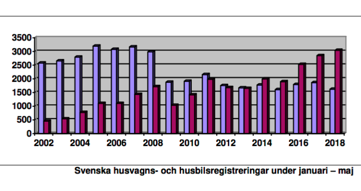 Maj månads husbilsregistreringar visar 1 138 stycken, medan det i maj föregående år registrerades 1 029 husbilar. Hittills under kalenderåret 2018 har det totalt registrerats 3 042 husbilar, medan det under motsvarande period 2017 registrerades 2 849 stycken. I procent innebär detta en ökning med 6,77 procent för år 2018.