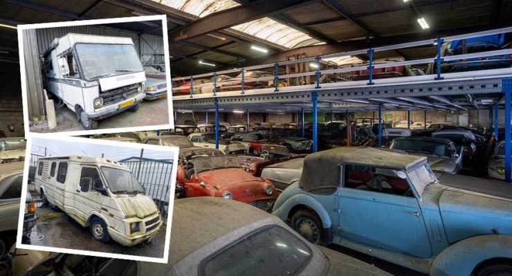 Det kallas ett av de största ladufynden som gjorts. Nu säljs de cirka 230 bilarna på auktion – bland dem en Hymer från 1976 och en Winnebago från 1989. Här är bilderna!