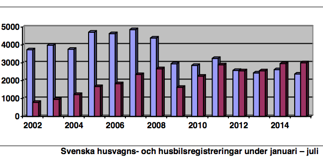 Juli månads husbilsregistreringar visar 472 stycken, medan det i juli föregående år registrerades 446 husbilar. Hittills under kalenderåret 2015 har det totalt registrerats 3 004 husbilar, medan det under motsvarande period 2014 registrerades 2 958 stycken. I procent innebär detta en ökning med 1,56 % för år 2015.
