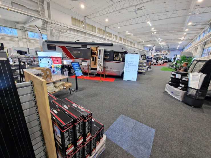 De säljer husvagnar från Polar och Hobby samt husbilar från Bürstner och Sunlight i de stora lokalerna på 4000 kvm.