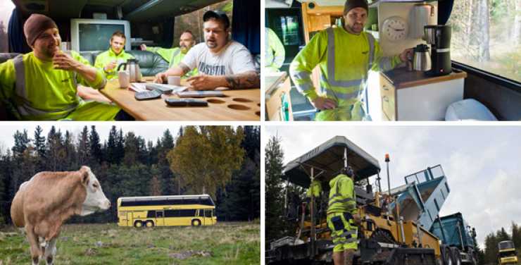 NCC AB har hyrt in en husbuss som har all nödvändig inredning för att sju asfaltsläggare ska kunna leva och bo under tiden de är ute på jobb. Detta för att effektivisera arbetet och slippa långa nätters åkande efter jobbet utförts.