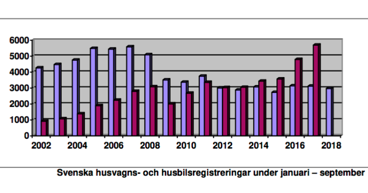 Enligt Trafikanalys har husbilsregistreringarna för hittilsvarande 2018 ökat med 13,6 procent medan personbilarna har ökat med 0,2. Under september månad 2018 nyregistrerades 19 886 personbilar, en minskning med 38,9 procent jämfört med september månad föregående år, men ser man enbart på privatmarknaden är minskningen 35,7 procent enligt Vroom. Diesel har minskat med 22,9 medan bensindrivna ökat med 20,8. Det har sålts 4 036 eldrivna bilar av de 291 636 som totalt sålts under perioden januari till september 2018.