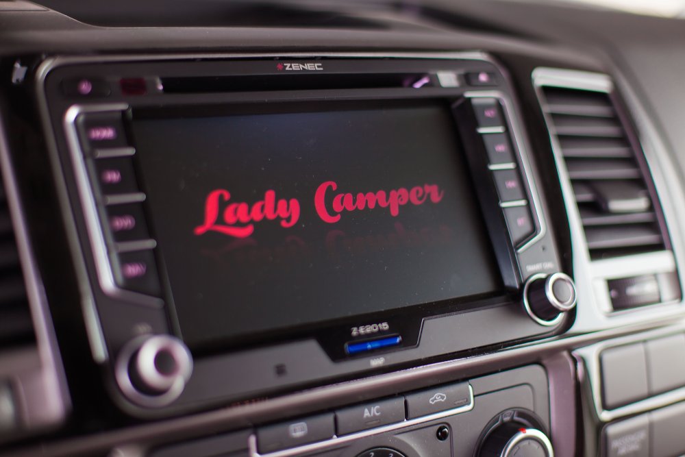 Avslutningsvis kryddar Hymer med en logo som visar en högklackad sko, text i rosa och en rosa dekor runt bilen. Förutom multimediaanläggningen förstås som startar med texten Hymer Lady Camper innan den visar backkamerans bild.
