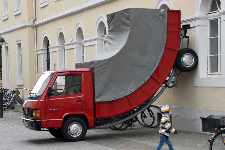 Det är den österrikiska konstnären Erwin Wurm som skapat tumultet. Han har nämligen gjort ett konstverk i form av en böjd lastbil i den tyska staden Karlsruhe. Tyvärr förstod inte, eller möjligen uppskattade inte, en nitisk parkeringsvakt det hela. I det här sammanhanget kanske det äldre ordet lapplisa har sin poäng.