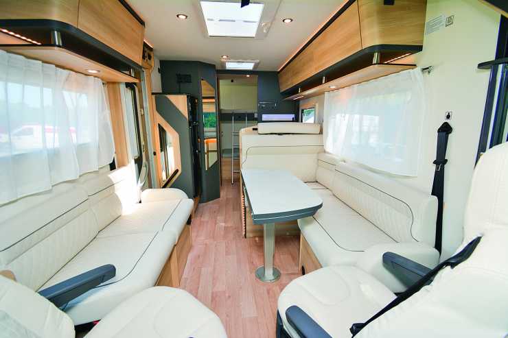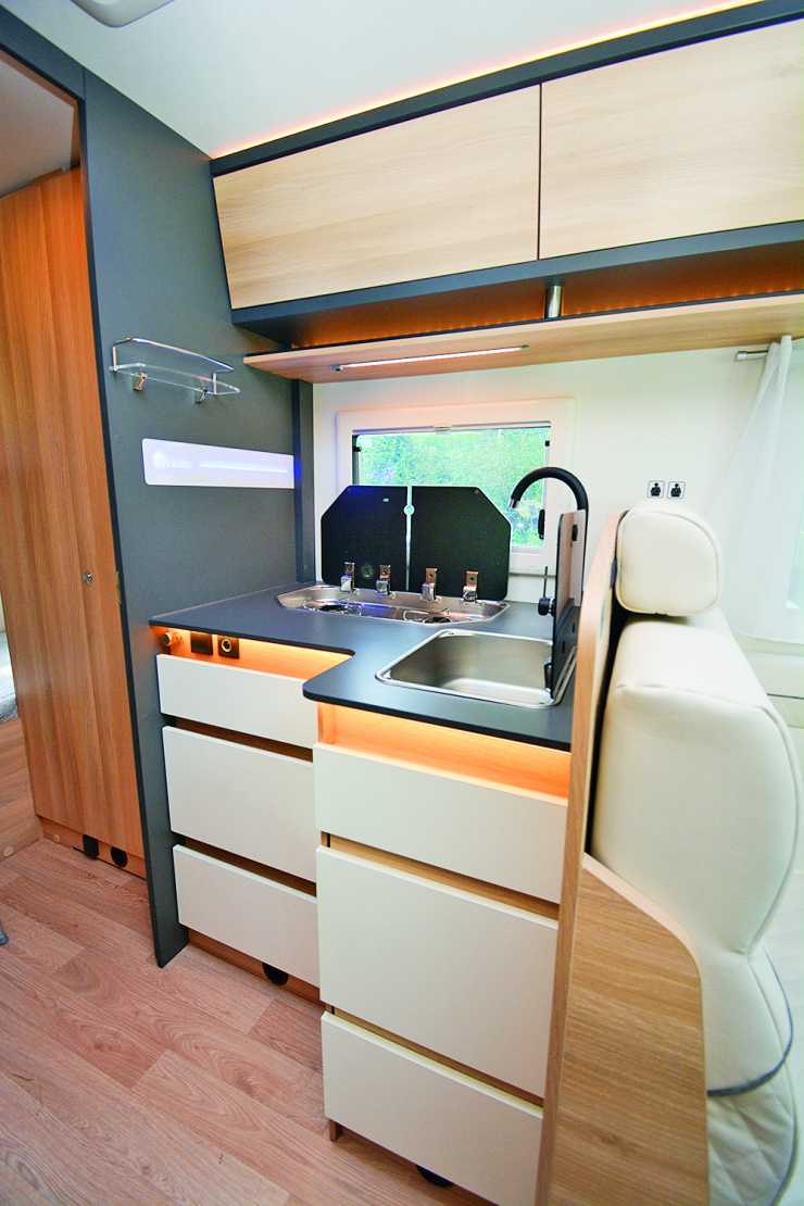 Den som svänger till vänster passerar ett hörnkök med kylskåp på 145 liter och dusch respektive toalett före våningssängen. Den som väljer högersväng kommer till den generösa soffdelen som också kan bäddas ut till en dubbelsäng på 217 x 137/119 centimeter. Ovanför förarhytten finns sedan takbädden som mäter 190 x 140 centimeter.