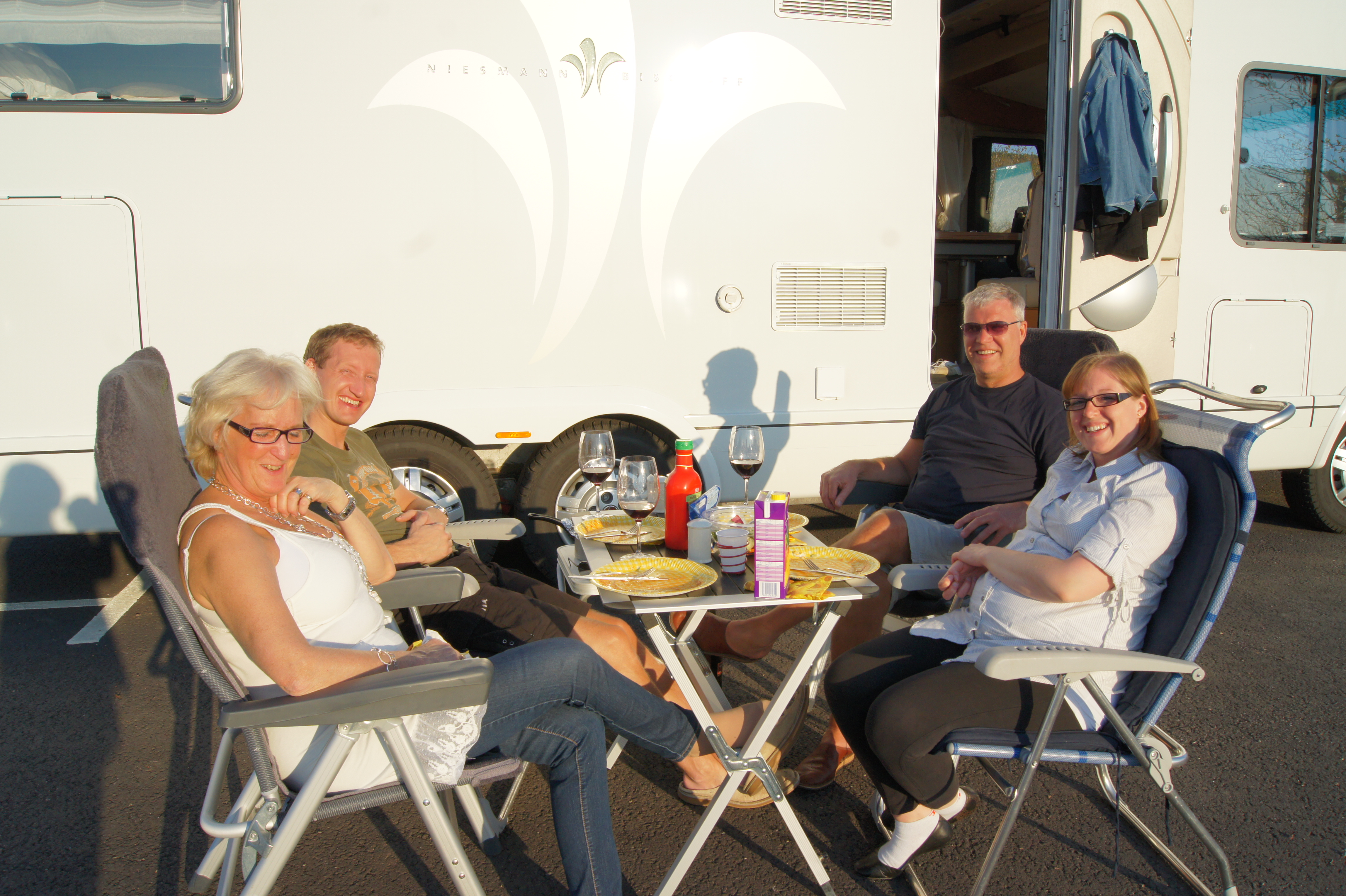 Gänget satt i den varma eftermiddagssolen på påskdagen och njöt av en god middag. Fordonet, en dubbelaxlad Niesmann, stod snyggt parkerad på ställplatsens ena långsida.